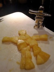4. Chop up the fruit, and add it to the blender. Feel free to first of all make interesting shapes with the fruit before you puree. Liberally add whatever other stuff to it that you want. I chose to add a couple of squeezes of honey, and probably way too much cinnamon. But, not being cinnamony enough is simply a crime that I refuse to commit.