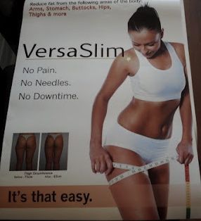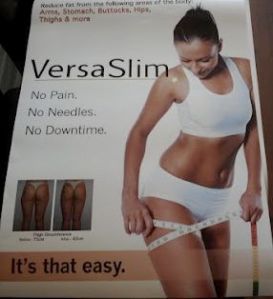 Well, call me Ms. Pig of Guinea, because today was her final certification day on the VersaSlim machine, and she needed a curvy body to complete the training. It is, to quote the brochure, ‘An Innovative Treatment for Fat Reduction and Body Reshaping’, with a smiling girl on the pamphlet (presumably the ‘after’ photo), clad only in her undergarments without an inch of orange peel anywhere to be spotted on her luminous skin. And the session would be complimentary. Talk about win-win – count me in!!