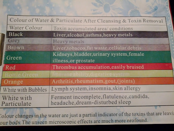 I offer Ion Detox foot Cleanses, too. I wan to let you know that the rust colour is from the salt quick rusting the electric coil. I know about those mystic charts that tell you that the colour of your water after the detox indicates problems in specific areas of the body. This is sadly made up. Salt and water do detoxify, and the machine does quicken and amplify the process, but the rest is mythical.
