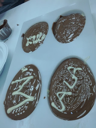 The workshop began with a festive Easter egg moulding session, where we used a diner ketchup dispenser full of molten white chocolate to decorate the outer shell, as well as to lovingly intersperse a couple of interior layers between ladles of liquid brown gold, aka milk chocolate.
