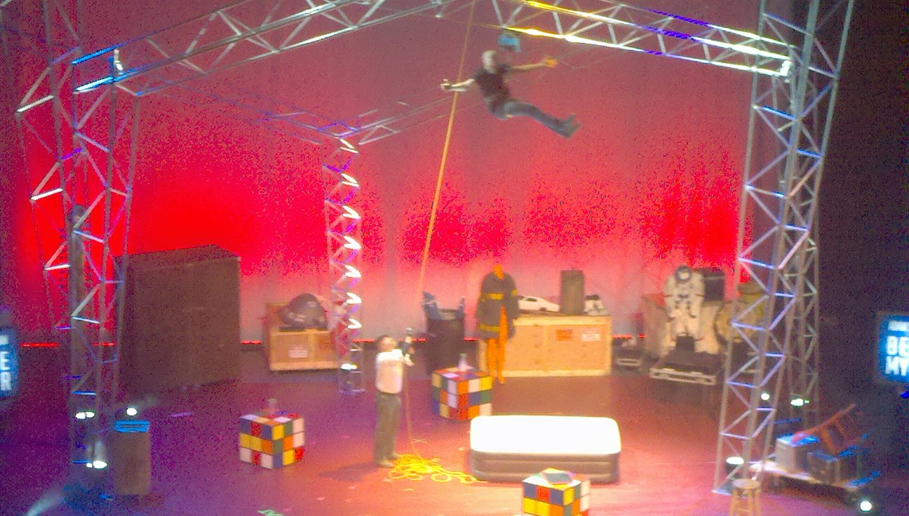 One memorable stunt on the TV show involved interlacing the pages of two telephone books together like you would shuffle a deck of cards. The friction caused by the pages makes the books nearly impossible to pull apart. In fact, it took two tanks to finally do so in that experiment. For the stage version, a father and son team from the audience prepared the books that Adam then used to suspend himself from in a harness hoisted about twenty or so feet above the stage by Jamie. Now that’s impressive!