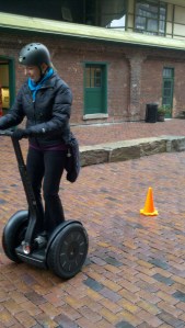 My perception today, however, was completely shattered, when I used a couple of my precious vouchers to take a segway for a spin in the Distillery District with LeLa. These babies rock! I totally want one for myself now. Can you imagine going through the grocery store, or Costco with one of these? Heaven! Mind you, there’s probably a few places that they’d give you the hairy eyeball if you used them, like on the golf course or at the gym. But those small-minded people just don’t get what the segway represents. From walking the dog to playing a riveting round of segway polo, it’s a lifestyle choice.