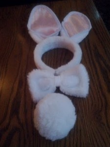 To prepare for it, I had wisely bought the recommended bunny ears as part of a set, complete with a bow tie and tail for all of $2 at Dollarama. Although the package had a picture of a young child on it, and it was next to baskets for collecting eggs, the headband managed to neatly span my gigantic cranium, and the other two pieces were on stretchy elastic bands that attached with velcro. Perfect.