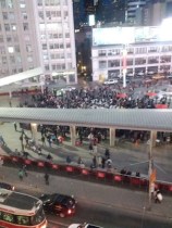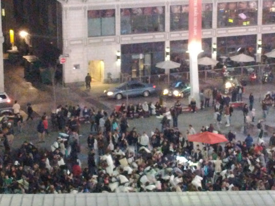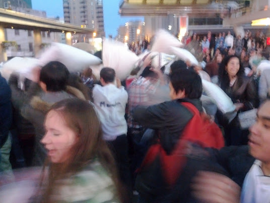 There were a plethora of cameras and a local film crew or two, so the spectacle even made it on the local news and jumbotron overlooking the square. Before I threw in the towel, I offered my pillow to a young lad whose face lit up like a Christmas tree, and whose father then deftly navigated him and his sister into the melee. He was indeed a Happy Boy. The Pillow Fight – Bunny Edition continued for about an hour and a half. There are definitely some swingers out there with serious stamina! Hmm, is it just me, or does that sound dirty? Ah well.