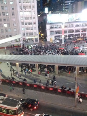 After downing our pints of liquid courage, we made it to the square on time, got a good grip on our pillow cases, and, well, started swinging. In a word? Awesome! We were giggling away, hurling our pillows at friendly strangers, and getting our bunny ears periodically knocked clean off our heads. Good times! After about 20 minutes, we had had enough – it’s surprisingly exhausting to keep whirling like that. So we crossed the street for a celebratory pint on the patio at Jack Astor’s, where we could continue to oversee the action from a fantastic vantage point.