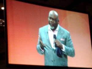 The Bishop T.D. Jakes was up next. I personally was not familiar with him, but liked him instantly. Having survived raising a brood of children with the same women by his side for 30-odd years, he has earned his stripes and spoke to us like the elder he is, imparting wisdom in an aw shucks kind of manner. Something about him kept reminding me of Will’s uncle Phil from The Fresh Prince of Bel-Air. His message involved looking at your station in life and the people you surround yourself with. Do you want to be a chicken, poking around in the yard, occasionally eating poo and never being able to fly, or do you want to spread your wings and soar like an eagle, incidentally mating in flight, and only with other eagles? This choir is converted. Baby, we’re here to soar!