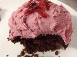 While that was happening, Lesia let us frost some chocolate cupcakes she had pre-made and brought with her. The icing contained a shortening made from a blend of cooking oils, powdered sugar, vanilla bean, and, surprisingly, a little beet juice to make it a pretty shade of pink. It was perfectly fluffy, creamy and delicious, and, fortunately, tasted nothing at all like the batter. We each devoured our cupcake in no time flat.