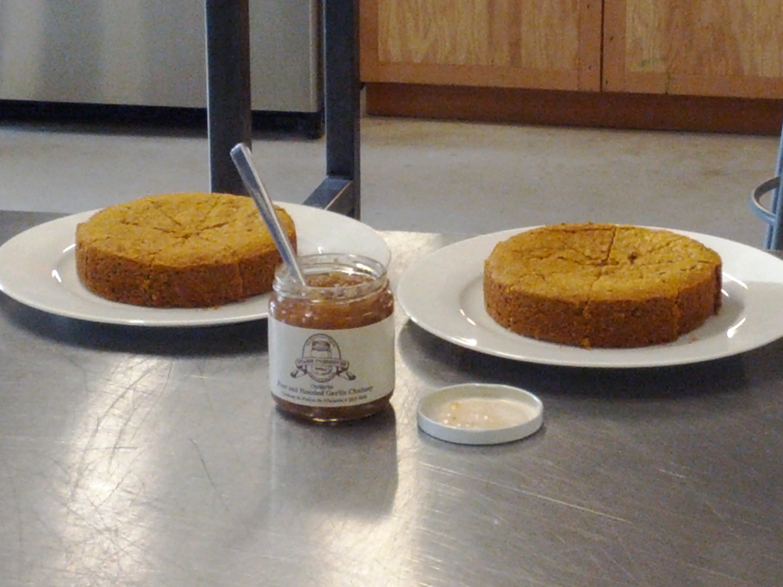 Upon arriving, we were greeted with vegan and gluten-free cornbread that was made even more delectable by spreading a local savoury pear and roasted garlic chutney on it. Besides love, the cornbread was made with dried chanterelle mushrooms, of all things! The vegan twist was the use of brown rice milk, guar gum, coconut oil and maple syrup instead of the usual suspects (although agave nectar could have been used instead of the maply goodness). As many of the ingredients as possible for everything in the workshop tonight, including the chutney, were sourced at the EBW market this past Saturday by Lesia Kohut, our instructor and owner, as well as head cake baker, at LPK’s Culinary Groove (which, if you haven’t been and tried their (not-quite-vegan) spicy chèvre noir shortbread, you have been missing out big time – they are simply incredible!).