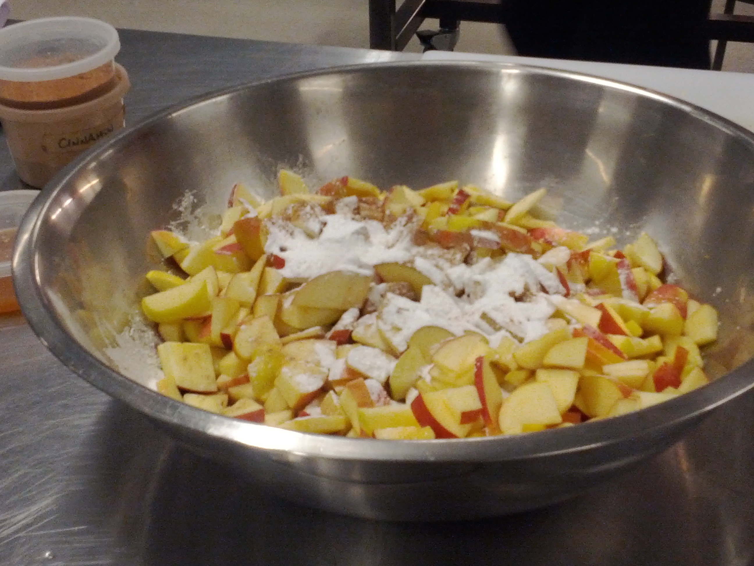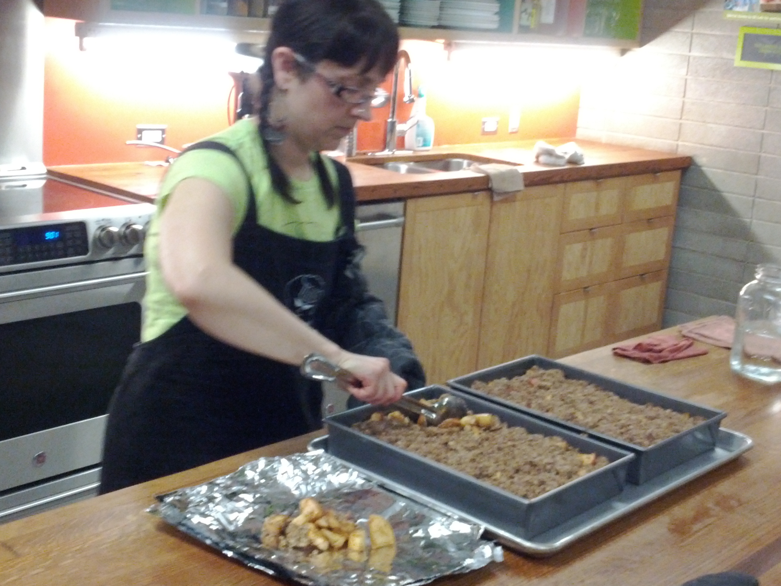 With the cupcakes in the oven, we moved onto our final recipe, which was vegan and gluten-free apple crisp. We all helped to slice the apples, and seasoned them to taste with cinnamon, nutmeg, vanilla, lemon juice, and apple cider. We decided the apples were sweet enough, so we skipped the agave nectar. Only the tapioca starch struck me as unusual here, along with some of what went into the streusel topping besides the oats, which included coconut oil, coconut sugar, and some of the gluten-free flour mix. The apples were first roasted before the topping was added.