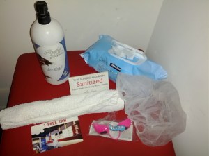 So it was with some trepidation that I entered the tanning salon, and tried to drink in all of the important information that was being sprinkled at me. I was assured that the ingredients in the spray were all natural and organic, and that the actual application would take a grand total of about six seconds. I was also instructed to use the cream that was provided to coat my fingernails, soles of my feet, and any other areas that probably should not be tanned, like in between my fingers and toes. I was then given a hairnet to wear, and told to listen to the woman’s voice who would guide me through the rest of the procedure. Oh crap. Listening, but more importantly, remembering, is not exactly my forte.