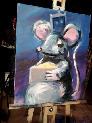The first two sets of paintings were thus put aside for the silent auction, as the easels and floors were tidied and cleared to make way for the final four. Two of the contestants had battled before as a team in a doubles event, and chose a common muse that would make it all the more interesting for their own particular rivalry: a rat. Yep, true story.