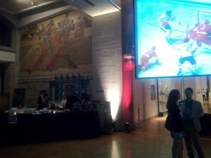 Of course, with a theme like Oh Canada, Eh? there were ginormous screens everywhere showing, what else, hockey. On one entire wall of the main gallery, conveniently located between Fidel Gastro and Waffle Bar tasty street eats, the legendary 1972 Canada vs. USSR game 8 of the Summit Series in Moscow was being projected for all to enjoy. As if that weren’t enough, NHL’s Greatest Goals From the Last Quarter of the 20th Century was also playing in another area, presumably because, statistically speaking, the odds were in our favour that the goals were all scored by Canadians.